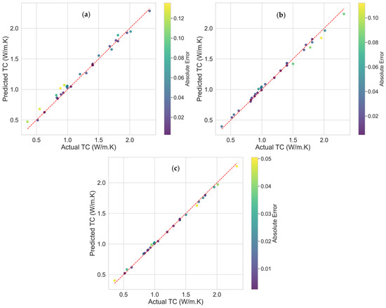 The predictive performance of the developed MLP model for the three scenarios is evaluated on an independent test dataset that can be graphically seen in Figure 8 and Figure 9. Comparing the actual and predicted thermal conductivity results for each scenario, a distinct pattern emerges, underscoring the model’s significant performance enhancement when integrated with synthetic data. In Figure 8a, we present the predictions for the first case, wherein a considerable portion of the points align with the ideal x = y line. However, some deviations are noticeable, with errors exceeding 0.12. Figure 8b,c illustrate scenarios where the model is trained using synthetic data. In both instances, incorporating synthetic data leads to a discernible improvement in prediction accuracy and a notable error reduction. Scenario (c) stands out, boasting a larger dataset and delivering the most compelling outcomes. This scenario achieves the optimal combination of performance metrics, represented by a best-fit line with an impressive R2 value of 0.9975 and a minimal RMSE of 0.0244.