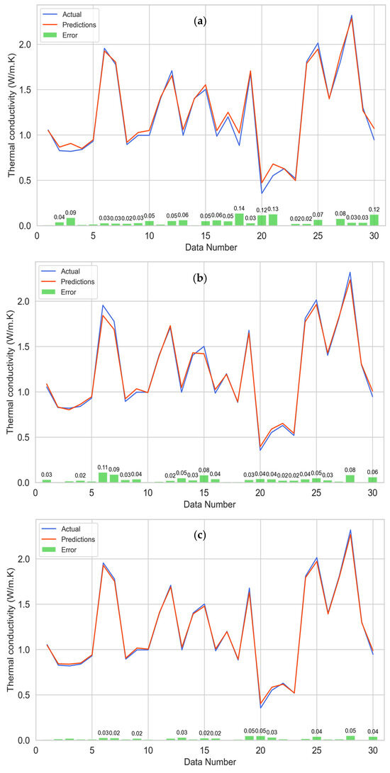 In Figure 9a, we depict the model utilizing solely the real dataset, while Figure 9b,c display the model trained with both the 200-point and 1000-point datasets, respectively. Although Figure 9a reveals a close alignment between predicted and real points, some discrepancies across various data points with errors as high as 0.13 and 0.14 W/m.K observed. Moving to Figure 9b, a significant reduction in these discrepancies becomes evident, especially within the low thermal conductivity values spanning from 0.5 to 1.0 W/m.K in range. This evidence signifies a marked improvement in prediction accuracy, resulting in a substantial decrease in both the number of points with errors and the magnitude of these errors, reducing the maximum error to 0.11 W/m.K. Figure 9c unveils an even more prominent enhancement in accuracy, with predictions exhibiting a higher level of precision and a further reduction in errors. In this case, the most significant error recorded is 0.05 W/m.K.