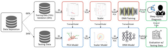The structure of this manuscript is organized into four sections. The proposed method of OSA prediction is introduced in Section 2, followed by Results and Discussion in Section 3 and Section 4. The Conclusions are provided in Section 5. The proposed framework consists of three processing steps: (1) unsupervised preprocessing for attaining principal components, (2) feature scaling based on standardization, and (3) classifying for the prediction of sleep apnea. This study converts 38 binary or categorical variables into continuous variables, using the PCA maximum-attribute filter; it can help minimize data discretization. The proposed method would be particularly useful in identifying severe OSA with acceptable sensitivity and specificity levels, which would also reduce examination costs in sleep testing.
