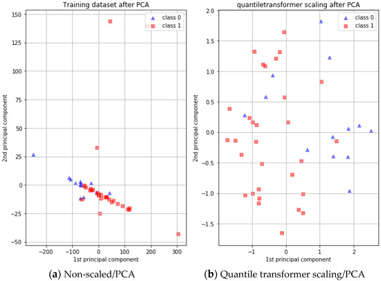 Principal component analysis (PCA) is a simple yet powerful non-parametric method for extracting meaningful information from complex datasets. Typically, PCA efficiently defines new features and reduces dimensionality to uncover hidden or simplified structures suitable for classification algorithms during preprocessing [38]. However, given the unique nature of our dataset, which comprised categorical or binary variables instead of continuous ones, PCA was used to convert these variables rather than reduce or adjust dimensions. Raw collected data often contain noise, making them unsuitable for direct input into a deep neural network (DNN) classifier. Therefore, we utilized the PCA maximum-attribute filter to transform binary or categorical variables into continuous variables. This approach effectively minimized data discretization, resulting in a cleaner dataset for model training. Figure 2 illustrates the first and second principal components derived from the data: Figure 2a depicts a non-scaled PCA, while Figure 2b shows a PCA with a quantile transformer scaler. The combination of a DNN and PCA–quantile transformer scaler provided the best performance, demonstrating the effectiveness of this preprocessing strategy in handling our dataset’s unique characteristics.