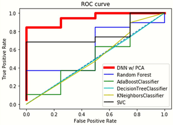 The proposed classification algorithm yielded a reliable computational result, as shown in Table 1, with five performance parameters, such as the area under the receiver operating characteristic (ROC), Sn, Sp, Pr, and Ac. The optimal performance result based on the threshold of 0.875 shows an area under ROC (AUC) of 94.7%, an Sn of 94.74%, an Sp of 75%, a Pr of 94.74%, and an Ac of 91.30%. The threshold determined the empirical balance between sensitivity and specificity. The AUC, as well as common performance metrics (i.e., Sn, Sp, Pr, and Ac), is known to reflect the performance of the algorithm [45]. The ROC curve and the AUC of the DNN model were compared to the other classifiers, including random forest (RF) [46], AdaBoost (ADB) [47], K-neighbors (KNs) [48], support vector machine classifier (SVMC) [49], and decision tree (DT) [50], as shown in Figure 4 and Table 2. The proposed DNN/scaled PCA algorithm was optimal, followed by the SVMC, and the top two best results are highlighted in bold in Table 2. In order to further analyze the results in more detail, we plot the confusion matrices as shown in Table 3 and Table 4, indicating the best result and three-fold cross-validation results from scaled PCA processing. As can be seen, the proposed model has a good classification ability in severe sleep apnea.