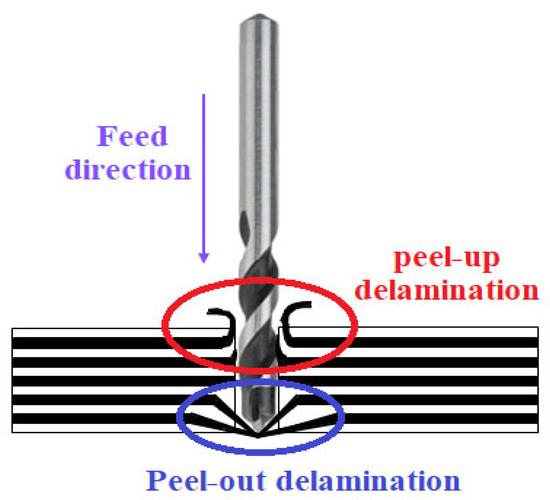During the drilling of composite materials, delamination is the most common defect occurring in the hole areas, which adversely affects the hole’s performance. The entry and exit points of the hole are susceptible to delamination. There are two types of delamination: peel-up and pull-out, which occur at the entrance and exit of the hole, respectively (Figure 1). At the hole entrance, the cut layers of the laminate tend to move upwards along the drill flute and separate from the uncut layers, influenced by the downward thrust force, thus leading to peel-up delamination [2]. When the drill tip reaches the surface of the bottom laminates, the uncut layers deflect due to the downward thrust force of the drill. If the thrust force exceeds a critical value, the uncut layers may separate from the other laminates, resulting in push-out delamination [3]. Thrust force plays a crucial role in controlling the drilling process to avoid defects in drilled holes, particularly delamination.