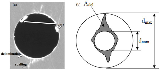Various types of discontinuity can occur due to the drilling process in composite materials, which include delamination, cracks, spalling, and burr. Delamination is the separation of composite layers because of the failure of the interplay resin interface. Some parts of the outer layers of the composite peel off from the laminate surface to produce spalling. Burr is uncut groups of fibers protruding to the interior of the hole. These types of defects are illustrated in Figure 3a.