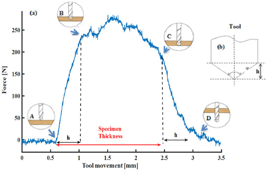 (a) Thrust force distribution for a complete drilling cycle, obtained using a rotational speed of 2400 mm/min, feed rate of 6000 rev/min, and angle of layers ±45. (b) Parameter h in tool geometry.