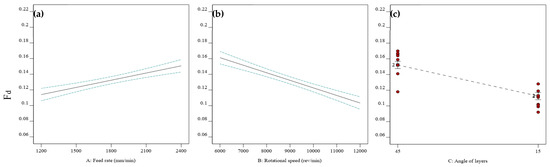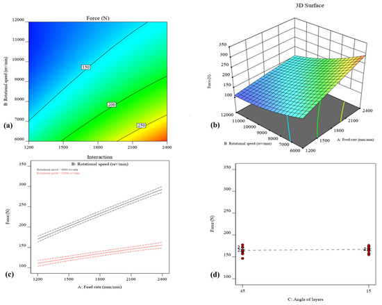Considering the significance of the interaction effect between the feed rate and rotational speed, the interaction, surface, and contour plots between these parameters were depicted to investigate the impact of independent variables on the response. As shown in Figure 5a–c, the minimum Fmax value was obtained at lower and faster values of feed rate and rotational speed, respectively. By increasing the feed rate value, the chip cross-sectional area will be more significant, and consequently, the cutting resistance increases. This phenomenon results in an increasing thrust force value. In contrast, increasing the rotational speed increases the friction between the drill and the composite during the drilling process; consequently, softening of the composite will occur due to increasing the drilling temperature. As a result, the required cutting energy and its thrust force decreased. These results are in accordance with the literature [6,16,17,18,28,29,30]. According to Figure 5d, the angle of the layers did not affect the Fmax.