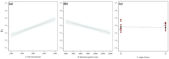 The main effect of rotational speed, feed rate, and layer orientation on the second response (Fa) (a) Feed rate. (b) Rotational speed. (c) Angle of layers.