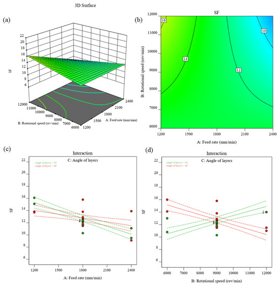 The ANOVA of the experimental data (Table 6) emphasized that the quadratic model was significant (Model Prob > F less than 0.05) for the SF response. The main effects of the feed rate and the interaction effect of all parameters were substantial. The fitted equation in terms of actual factors for predicting shape factor was obtained as Equation (7) for each angle of the layers’ types. For investigating the effect of independent variables on the shape factor, the interaction, surface, and contour plots relating to the significant items were depicted. In these figures, the angle of layers was considered the average of its two levels. As shown in Figure 8a,b, the maximum SF value was obtained at lower and higher levels of feed rate and rotational speed, respectively. In these levels of feed rate and rotational speed, the higher value of SF was obtained on the angle of the layers equal to 15 degrees. Softening of the composite at a higher rotational speed due to increasing the temperature, reducing the violent fraction of composite at a lower feed rate and a smoother distribution of the thrust force at lower angles between the sequence of the layers, leads to a higher shape factor response (Figure 8c,d).