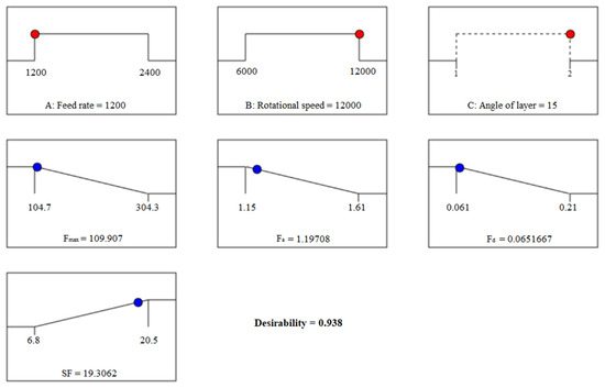 The ramp function graphs indicating the optimum values of input independent variables and output response for minimizing the Fmax, Fa, and Fd and maximizing the SF with a desirability value of 0.938 are presented in Figure 9. The confirmatory experiments were used to validate this solution. The experimental Fmax, Fa, Fd, and SF values for a composite with a ply angle equal to 15, feed rate equal to 1200 mm/min, and rotational speed equal to 12,000 rev/min were 110.2 ± 4.06, 1.2 ± 0.05, 0.07 ± 0.01, and 20.2 ± 0.3, respectively. These results indicate the efficiency and suitability of the preparation techniques and the accuracy of the proposed models.