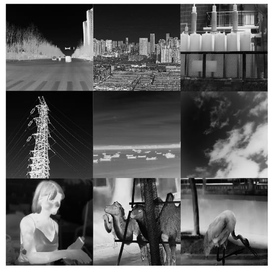 Therefore, we constructed a multi-scene infrared super-resolution image dataset []. This dataset contains a total of 7224 images across nine distinct scenes, including seascape images, animal images, industrial scenes, urban landscapes, natural landscapes, indoor images, portraits, surveillance perspectives, and vehicle perspectives, as shown in Figure 1. The majority of images have resolutions of (1280 × 1024, 1920 × 1080), with a minority of (640 × 512), providing rich details and texture information with high resolution and quality. This dataset facilitates the development of more powerful and accurate super-resolution algorithms using real-world high-quality infrared image data, thus promoting the application of infrared super-resolution technology across diverse fields.
