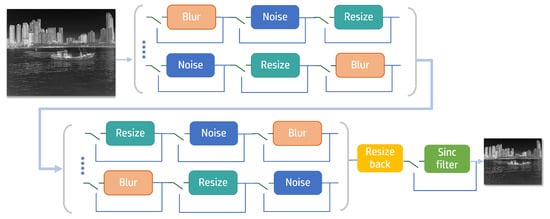 The proposed degradation model aims to reduce computational complexity, while enriching the degradation space. In the degradation process, a gate mechanism and random shuffle strategy are introduced into the second-order degradation model of Real-ESRGAN. Additionally, based on the characteristics of the experimental data and infrared devices, JPEG compression was not performed. This decision was made because the experimental data were stored in a single-channel format, while JPEG compression was primarily used for compressing color information in RGB images. Moreover, in practical scenarios, infrared devices can always export in lossless BMP format, thereby minimizing the need for JPEG compression of their images. Consequently, JPEG compression was excluded from the degradation process. The architecture of the proposed degradation model is illustrated in Figure 2.