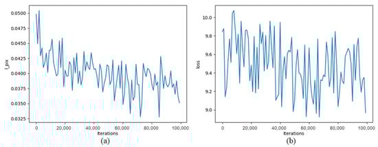 Relationship between iterations and loss. (a) This panel depicts the relationship between the training iterations and loss for Inf-OSRNet. During this phase, there was a notable trend of fluctuating decline in the loss as the iterations progressed. (b) The relationship between the training iterations of Inf-OSRGAN and loss. In this phase, while the loss decreased with increasing iterations, the trend was less pronounced.
