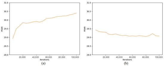 Relationship between iterations and PSNR. (a) This panel depicts the relationship between the training iterations and PSNR for Inf-OSRNet. During this phase, as the number of iterations increased, the PSNR exhibited a trend of rapid initial growth followed by a slower increase. (b) This panel illustrates the relationship between the training iterations and PSNR for Inf-OSRGAN. In this phase, the PSNR demonstrated a decreasing trend as iterations increased.