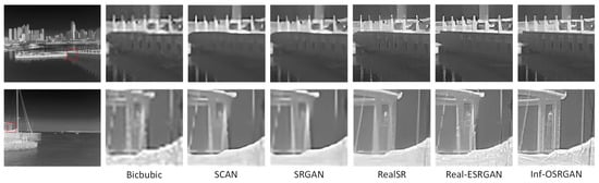 To demonstrate the advantages of the proposed model, we trained six 4× super-resolution networks using the widely used Real-ESRGAN generator, namely RRDBNet, and executed comparative experiments on diverse datasets. To reduce redundant computations and adapt to infrared images, we modified the input and output channels to be single-channel and used LR/HR synthetic pairs generated by the proposed degradation model for training. Firstly, we trained the first-stage model, Inf-OSRNet, using loss with a learning rate of . Then, we trained a Inf-OSRGAN model, which combined loss, perceptual loss, GAN loss, and spatially correlative loss with weights and a learning rate of . Both stages of training were iterated 100,000 times, using the Adam optimizer.