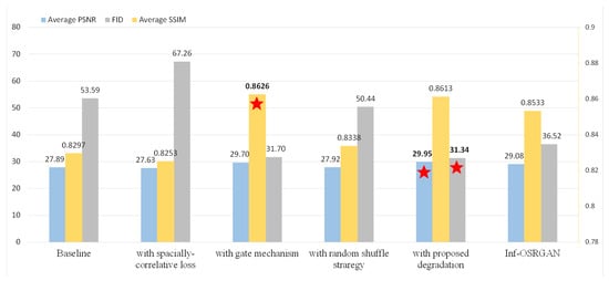 The traditional metrics primarily focus on the pixel-level similarity and statistical features of an image, rather than maintaining the structural consistency. Therefore, when introducing spatially correlative loss, the reconstructed image’s structure may be more pronounced, but a decrease in comparison with traditional metrics may be observed. This does not imply a decline in the actual visual quality and enhancement of details. In fact, enhancing spatial consistency can improve the structure and details of an image, leading to improved perceptual quality. Spatially correlative loss can effectively handle texture details and high-frequency information. Super-resolution tasks often involve the recovery of textures and edges. Traditional loss functions may struggle to capture these intricate patterns and tend to amplify artifacts of the generated images. In contrast, spatially correlative loss incorporates spatial information, enabling the network to better preserve and reconstruct these high-frequency components. This leads to sharper and more accurate representations of the underlying structures in the super-resolved images.