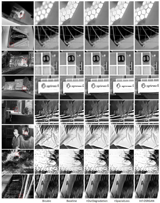 Figure 8 displays the results of the super-resolution model on high-resolution images (1280 × 1024) from the test set proposed in Section 2.3, with the bicubic upsampled LR images used as references.