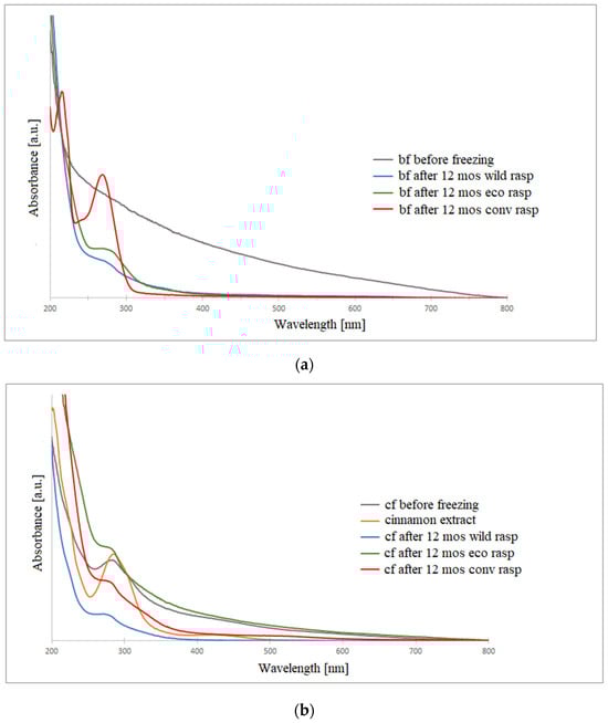 The UV–Vis absorption spectra of the studied films including base film (a) and the films with the addition of cinnamon (b), ginger (c), and turmeric (d) extracts before and after storage. Explanation: bf before freezing-base film (sodium alginate with chitosan) before freezing; bf after 12 mos conv rasp-base film after 12 months of freezing stored with conventional raspberries; bf after 12 mos eco rasp-base film after 12 months of freezing stored with organic raspberries; bf after 12 mos wild rasp-base film after 12 months of freezing stored with wild raspberries; cf before freezing-film (sodium alginate with chitosan) with cinnamon extract before freezing; cinnamon extract-cinnamon extract used in the production of film; cf after 12 mos conv rasp-film with cinnamon extract after 12 months of freezing stored with conventional raspberries; cf after 12 mos eco rasp-film with cinnamon extract after 12 months of freezing stored with organic raspberries; cf after 12 mos wild rasp-film with cinnamon extract after 12 months of freezing stored with wild raspberries; gf before freezing-film (sodium alginate with chitosan) with ginger extract before freezing; ginger extract-ginger extract used in the production of film; gf after 12 mos conv rasp-film with ginger extract after 12 months of freezing stored with conventional raspberries; gf after 12 mos eco rasp-film with ginger extract after 12 months of freezing stored with organic raspberries; gf after 12 mos wild rasp-film with ginger extract after 12 months of freezing stored with wild raspberries; tf before freezing-film (sodium alginate with chitosan) with turmeric extract before freezing; turmeric extract-turmeric extract used in the production of film; tf after 12 mos conv rasp-film with turmeric extract after 12 months of freezing stored with conventional raspberries; tf after 12 mos eco rasp-film with turmeric extract after 12 months of freezing stored with organic raspberries; tf after 12 mos wild rasp-film with turmeric extract after 12 months of freezing stored with wild raspberries.