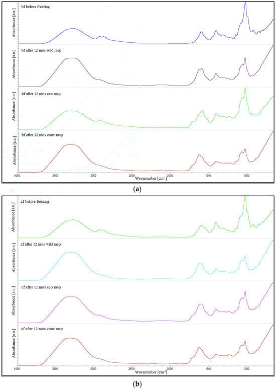 The FTIR spectra of base film (a) and the films with cinnamon (b), ginger (c), and turmeric (d) extracts before and after storage. Explanation: bf before freezing-base film (sodium alginate with chitosan) before freezing; bf after 12 mos conv rasp-base film after 12 months of freezing stored with conventional raspberries; bf after 12 mos eco rasp-base film after 12 months of freezing stored with organic raspberries; bf after 12 mos wild rasp-base film after 12 months of freezing stored with wild raspberries; cf before freezing-film (sodium alginate with chitosan) with cinnamon extract before freezing; cf after 12 mos conv rasp-film with cinnamon extract after 12 months of freezing stored with conventional raspberries; cf after 12 mos eco rasp-film with cinnamon extract after 12 months of freezing stored with organic raspberries; cf after 12 mos wild rasp-film with cinnamon extract after 12 months of freezing stored with wild raspberries; gf before freezing-film (sodium alginate with chitosan) with ginger extract before freezing; gf after 12 mos conv rasp-film with ginger extract after 12 months of freezing stored with conventional raspberries; gf after 12 mos eco rasp-film with ginger extract after 12 months of freezing stored with organic raspberries; gf after 12 mos wild rasp-film with ginger extract after 12 months of freezing stored with wild raspberries; tf before freezing-film (sodium alginate with chitosan) with turmeric extract before freezing; tf after 12 mos conv rasp-film with turmeric extract after 12 months of freezing stored with conventional raspberries; tf after 12 mos eco rasp-film with turmeric extract after 12 months of freezing stored with organic raspberries; tf after 12 mos wild rasp-film with turmeric extract after 12 months of freezing stored with wild raspberries.