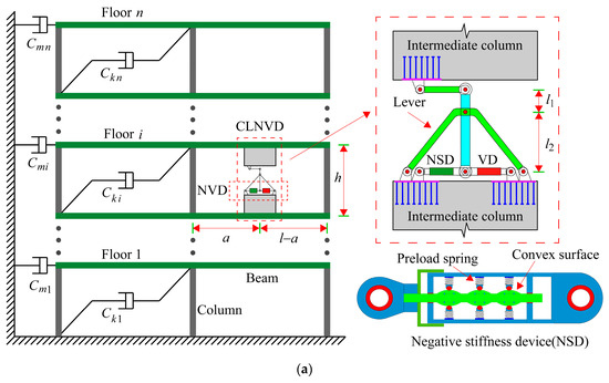 The coefficients and of CLNVD are jointly affected by the intermediate column’s position , the lever’s amplification factor , the bending line stiffness of the beam, negative stiffness , and damping coefficient . For the convenience of parameter analysis, the single-story structure shown in Figure 6 is taken as the analysis object.