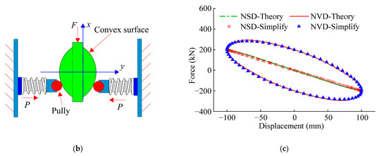 When NVD generates sinusoidal deformation, NVD and NSD’s hysteresis curves are presented in Figure 1c. This sinusoidal deformation has an amplitude of 100 mm and a circular frequency of 1 rad/s. The spring stiffness is 1.2 kN/mm, and the preload displacement is 60 mm; the shape of the convex surface is f(x) = 50cos(2π/600x) − 7cos(2π/300x); the VD’s damping coefficient c = 2 kN/(mm/s). In NSD, there are a total of 12 preload springs acting on the convex surface. The simplified curve in Figure 1c represents the hysteresis curve with a negative stiffness of −2 kN/mm and a damping coefficient of c = 2 kN/(mm/s). According to Figure 1c, the simplified curve is in good accordance with the theoretical curve. Therefore, NVD can be composed of linear negative stiffness elements and viscous elements in parallel.