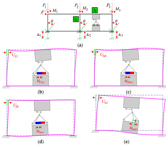In Equations (5) and (6), , , , and are the inter-story displacements under the action of F, M, △, and θ, respectively. , , , and are displacements of VD under the action of F, M, △, and θ, which is shown from Figure 2b–e. They are defined as follows:
