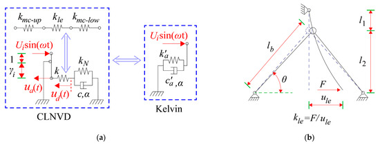 In order to achieve the transformation between the mechanical model of CLNVD and the Kelvin model, equal force, equal deformation, and equal energy dissipation are utilized here. The Kelvin model’s damping coefficient is , and the spring stiffness is , which is shown in Figure 4a. Assuming the sinusoidal deformation generated by CLNVD, according to the definition of , we obtain . According to equal force and equal deformation, , , and of VD are revealed as follows: