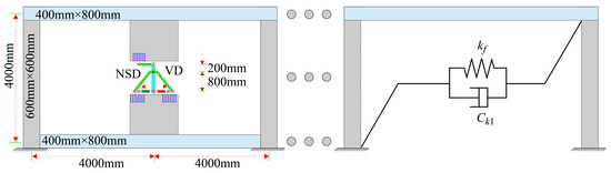 Figure 1 illustrates the negative stiffness device’s composition, the CLNVD’s structure form, and the hysteresis curve. In the multi-story structure, CLNVD is installed between the upper beam and the lower beam, which is shown in Figure 1a. The intermediate column’s position can be selected as per the building space. Hence, CLNVD can be flexibly arranged in the span. The viscous damper (VD) and negative stiffness device (NSD) are linked in parallel to constitute an NVD.