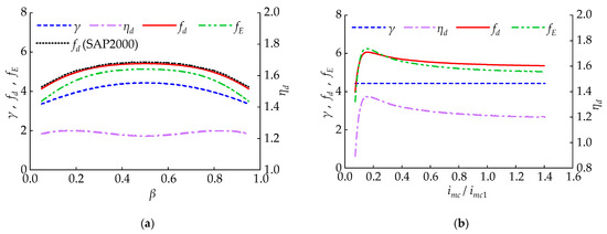 The intermediate column’s position affects CLNVD’s and . Figure 7 reveals the curves of , , , and with . As is described in Figure 7a, when the intermediate column moves from the ends of the span to the middle of the span, increases, while increases at first and decreases subsequently. However, the increase in is even greater. Therefore, when , and reach its maximum value. SAP2000 (Version 23.1.0) is used for numerical simulation, and seven seismic waves from Section 4.2 are selected. The analysis results of in this section are taken as the average of the seven seismic wave calculation results. The results indicate that the theoretical calculation results of are highly consistent with the numerical simulation results. In Figure 7b, refers to the intermediate column’s bending stiffness with the cross-section of 1600 mm × 250 mm. As is displayed in Figure 7b, and rapidly increase at first, and then slowly decrease with the increase in . A larger cross-section of the intermediate column is not conducive for CLNVD to obtain the peak value of and . In order to ensure that CLNVD has good energy consumption capacity, the CLVD is required to lie at the middle span under the condition that the building space allows this.