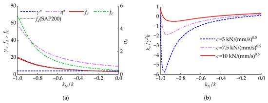 Figure 5 reveals the variation in the and the with . As increases, decreases while increases. In comparison with the traditional viscous dampers, NVD’s is improved due to the negative stiffness effect, while the degree of improvement weakens as increases. Meanwhile, when is smaller, . Therefore, the CLNVD provides a negative stiffness to the structure. On the one hand, the negative stiffness property of the CLNVD reduces the shear force demand of the structure; on the other hand, it raises the displacement demand. However, higher of NVD will suppress the displacement demand of the structure.
