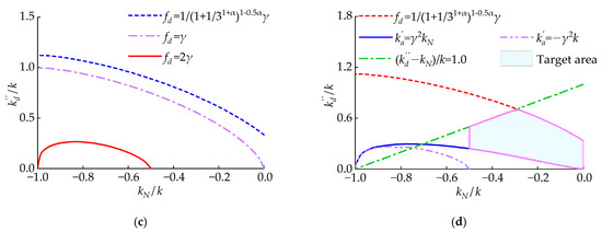Combining Equation (22) as well as Figure 11c, we can see that when , . Combining Equation (23) and Figure 11d, we can see that when , . When , . Through Equation (19), it can be obtained that when , . We can see from Section 3.1.4 that when , increases as the damping coefficient increases. Thus, according to the above analysis, it is recommended that the target area in Figure 11d should be taken as the range of values for and . Within this target area, we can see the following: ; ; rises when increasing the damping coefficient .