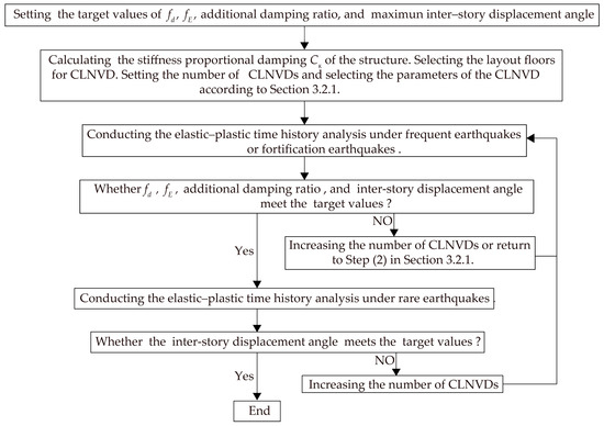 With the aim to evaluate the damping contribution of dampers to the overall structure and control the structure‘s deformation, the current vibration-reduction design methods mostly utilize additional damping ratios as well as the maximum inter-story displacement angle as control objectives. For additional CLNVD structures, this paper proposes a seismic design method with coefficient , coefficient , maximum inter-story displacement angle, and additional damping ratio as control objectives. In contrast to the structure without the CLNVD, the stiffness and damping properties of the multi-story structures with the CLNVD vary greatly, and such changes are difficult to predict before the actual calculation. Therefore, for the vibration-reduction design of the additional multi-story CLNVD structures, the current design method is to conduct trial calculations, while ensuring that CLNVD has a high energy consumption, until the proposed design goals are met. During the trial calculation process, it is necessary to utilize the optimization strategy in Section 3.2.1 to optimize CLNVD. Subsequently, the design is conducted according to the vibration-reduction design process in Section 3.2.2. Figure 13 illustrates the vibration-reduction design flowchart. The specific design steps are as follows: