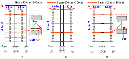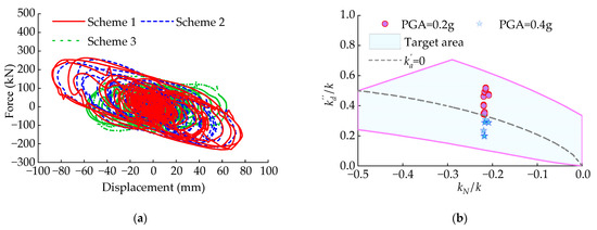 - CLNVD’s parameters (such as intermediate column section, lever section, negative stiffness, damping coefficient, and damping index) are selected so that the values of and are within the target area (See Figure 11d). The inter-story displacement target value and the iterative method in Section 3.1 can be used to calculate ; the is calculated through Equation (18).