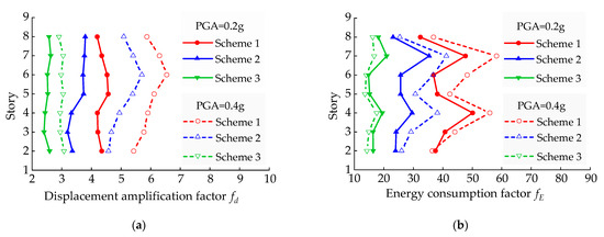 - and are substituted into Equation (3) to calculate the displacement amplification coefficient , and Equation (4) is utilized to calculate the energy dissipation coefficient .