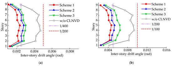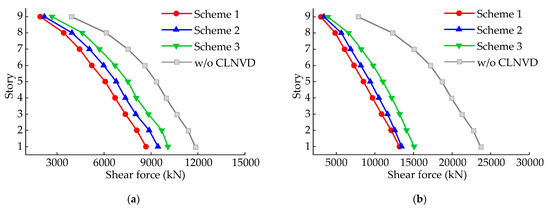 Figure 18 and Figure 19 reveal the structure’s inter-story displacement as well as story shear force under three different schemes. As shown in Figure 18, the CLNVD of Scheme 1 reduces the maximum of the structure’s inter-story displacement angle from 1/200 to 1/400 under fortification earthquakes, and from 1/100 to 1/200 under rare earthquakes, meeting the set goals. The inter-story displacement of all floors except for the ground floor has been reduced by almost 50%. From Figure 19, we can draw a conclusion that the shear force of each floor falls to a certain extent, while the magnitude of the decrease is different from the magnitude of the decrease in inter-story displacement. As is shown in Figure 17b, this is due to the positive stiffness effect and large damping effect of the CLNVD under fortification earthquakes and the negative stiffness effect and large damping effect under rare earthquakes.