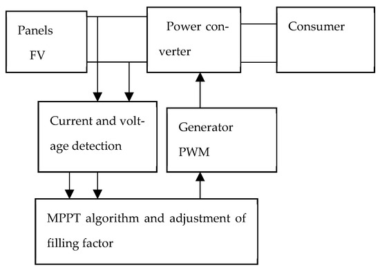 The MPPT algorithm may be implemented on a DC-DC converter connected between a photovoltaic system and a consumer (load or electric network), as shown in Figure 3, to adjust the voltage (or current intensity) on the output of the photovoltaic system, so that the maximum power available is extracted.