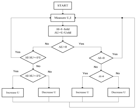 The incremental conductance algorithm is directly based on the power variations. The output voltage and current of the photovoltaic system FV are used in order to calculate the conductance and incremental conductance. The ratio between the power derivate and the voltage derivate is given by the relation [19,23]: