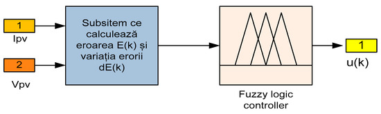The structure of the fuzzy logic controller is shown in Figure 7. The input variables are the error signal and the error derivate. The error signal is the signal at the output of the algorithm that follows up the maximum power point MPP. The basis of rules used in the case of this controller is shown at Table 1.