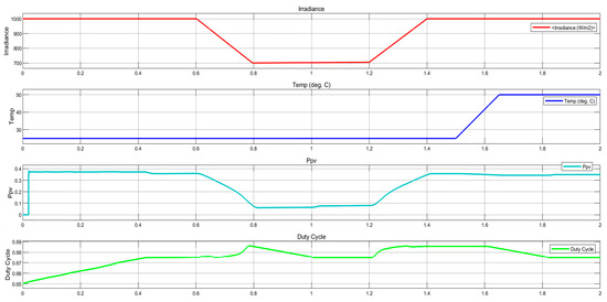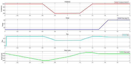 Figure 10 shows the results of the simulation for the buck DC-DC converter controlled through the P&O algorithm without a fuzzy logic controller.