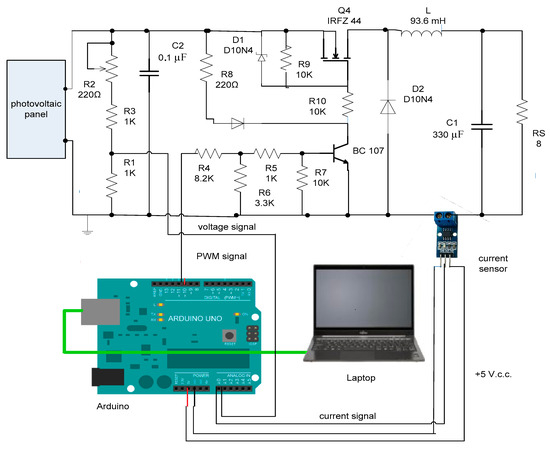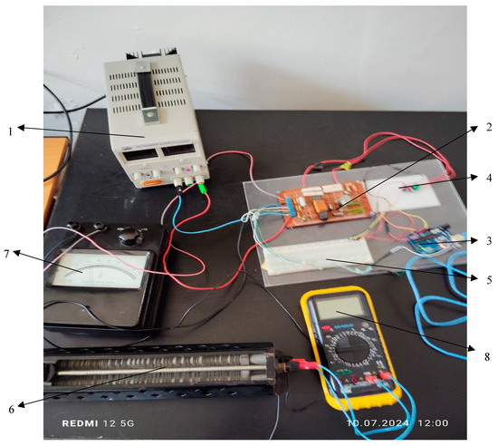 The components of the experimental stand were as follows: 1—DC source of adjustable voltage controlled through the current intensity, 2—DC-DC buck converter, 3—Arduino Uno development board, 4—current sensor, 5—breadboard, 6—load resistance, 7—ammeter, 8—digital multimeter. The direct voltage source was of the DC-Power Supply HY 3005D type, voltage (0–30) Vdc, current (0–5) A. The load resistance was a variable power resistance in the range (0–30) Ω at a current I = 5 A. The ammeter measured a maximum current of 5 A. The multimeter was used to measure the voltage in the range (0–200) Vdc.