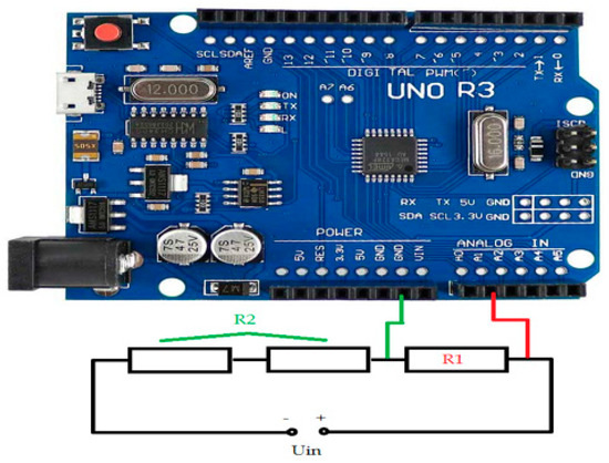 Instead of two suitable resistors (not available), one resistor of 100 kOhm was used as R1, and two resistors, series connected, one of 100 kOhm and one of 300 kOhm, whose sum, equal to 400 kOhm, corresponded to R2. The voltage on the panel was equal to 5 multiplied by the voltage read on the Arduino, Uent = 5 ∗ Uout. Figure 16 shows the diagram of the voltage divider connected to the Arduino.