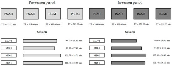 Structure of each training period studied. PS-M1 = microcycle one of the pre-season; PS-M2 = microcycle two of the pre-season; PS-M3 = microcycle three of the pre-season; PS-M4 = microcycle four of the pre-season; IS-M1 = microcycle one of the in-season; IS-M2 = microcycle two of the in-season; IS-M3 = microcycle three of the in-season; IS-M4 = microcycle four of the in-season; TT = total time; MD+1 = match day plus 1; MD-3 = match day minus 3; MD-2 = match day minus 2; MD-1 = match day minus 1.