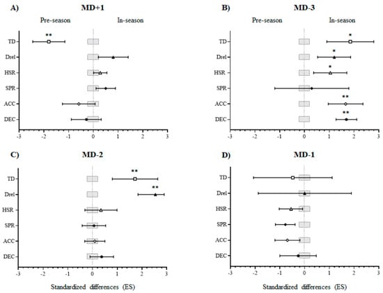 (A) MD+1 = match day plus 1; (B) MD-3 = match day minus 3; (C) MD-2 = match day minus 2; (D) MD-1 = match day minus 1; TD = total distance covered (m); Drel = relative distance covered (m/min); HRS = high-speed running (m > 18.8 km/h); SPR = sprint distances (m > 25.2 km/h); ACC = number of intense accelerations (>2.5 m/s2); DEC = number of intense decelerations (>−2.5 m/s2); ES = effect size. *, ** = denote difference between periods (p < 0.05 and p < 0.01, respectively).