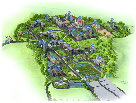 In order to create an integrated energy storage system, battery energy storage systems (BESSs) and hydrogen energy storage systems (HESSs) must be combined into a comprehensive framework. This process includes detailing the technical specifications of both BESSs and HESSs, as well as developing an integration architecture that ensures these systems function cohesively within the building’s energy grid. The architecture features advanced control systems equipped with sensors and communication protocols to optimize performance, manage efficient energy storage, facilitate smooth charge/discharge cycles for BESSs, and oversee effective hydrogen production and usage for HESSs. This integrated strategy aims to improve energy management and sustainability for the Engineering 5 Building (Building Number 120) at Kangwon National University (Figure 1):