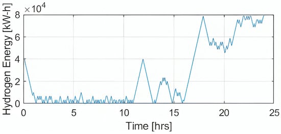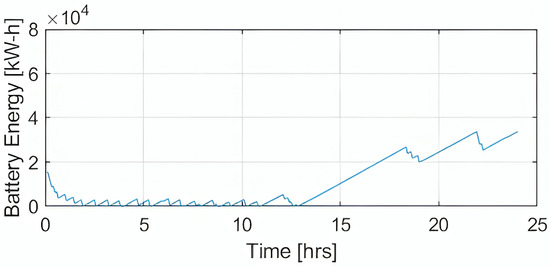 Figure 2 illustrates the variation in battery energy storage (in kW-h) over a 24 h period, showcasing the dynamics of the energy management system (EMS) in response to day–night cycles. The time axis spans from 0 to 24 h, with the vertical axis representing battery energy in increments of 10,410^4104 kW-h.