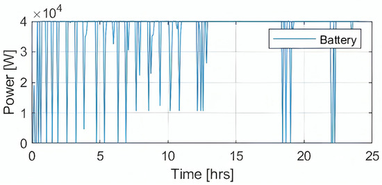 Figure 3 shows the power output of the battery (in W) over a 24 h period, capturing the real-time fluctuations managed by the energy management system (EMS). The horizontal axis represents time from 0 to 24 h, while the vertical axis denotes power in increments of 10,410^4104 W.