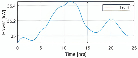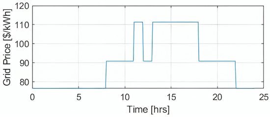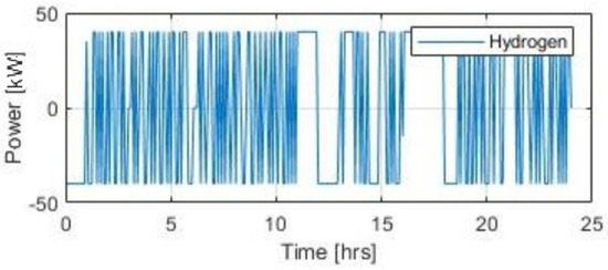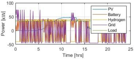 Figure 4 illustrates the grid power variations (in kW) over a 24 h period, as managed by the energy management system (EMS). The horizontal axis indicates time from 0 to 24 h, while the vertical axis shows power in kilowatts (kW), ranging from −50 kW to 100 kW.