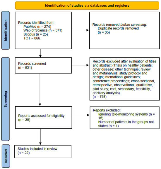 Only randomized controlled trials (RCTs) were included, while non-randomized or non-controlled trials, study protocols and designs, cross-sectional, retrospective, qualitative, observational, and pilot studies, conference proceedings, feasibility, cost, ancillary, and secondary analyses, and all studies not reporting the use of a telemonitoring system were excluded.