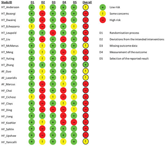 Each included study’s RoB2 domain scores are displayed in Figure 2. Twenty-one (95.5%) RCTs raised at least some concerns about bias. At the same time, only one (4.5%) was classified as having minimal risk of bias [52].