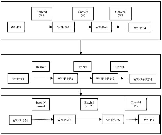The architecture of the generator network in the C3GAN model is illustrated in Figure 4. The generator begins with an initial convolutional layer (Conv2d) with a kernel size of , a stride of 1, 3 input channels (corresponding to the RGB channels of the image), and 64 output channels. After passing through this layer, the output feature map size becomes , calculated as .