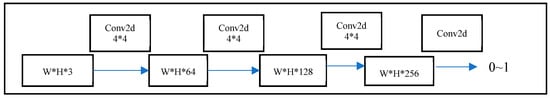 The architecture of the discriminator network in the C3GAN model is depicted in Figure 5. The first convolutional layer (Conv2d) of the discriminator has a kernel size of and a stride of 2, with 3 input channels corresponding to the RGB channels of the image and 64 output channels. After passing through this layer, the resulting feature map has a size of .