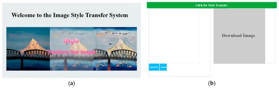 Main interface module. The main interface of the system shows the effect of image style transfer based on the C3GAN model, as shown in Figure 7. The image upload interface has a button for uploading files and an area for displaying images, allowing users to upload their own images and perform style transfer, and then download the images. The website’s graphical user interface is simple and beautiful, using the Bootstrap framework and providing important information and functions so that users can better use the system.